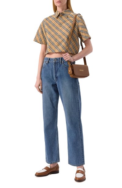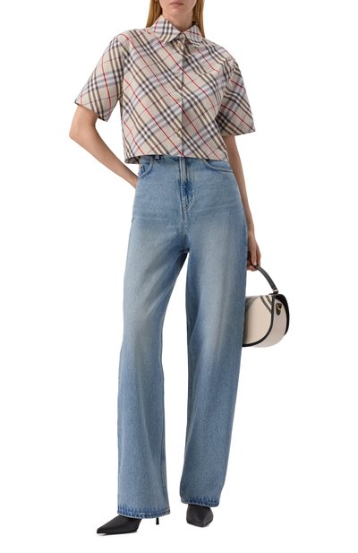 Рубашку с нагрудным карманом сшили из хлопкового поплина в клетку Burberry Check. Укороченная модель с перламутровыми пуговицами органично впишется в повседневный гардероб.