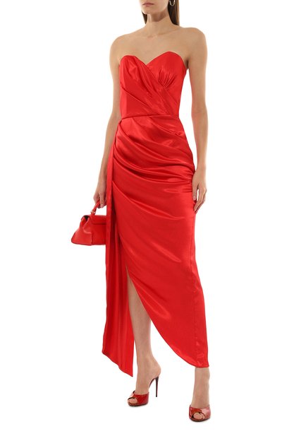 Коктейльное платье-бюстье с экстремально глубоким декольте застегивается на потайную молнию сзади. Модель с открытой спиной выполнили из полиэстера, плотно расшитого крупными пайетками.