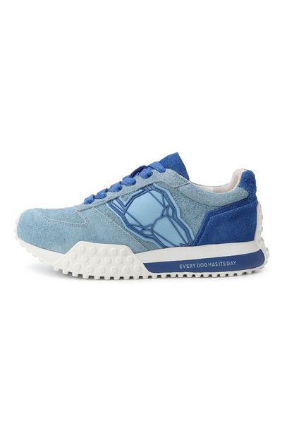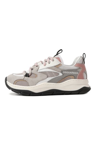 Кроссовки на широкой протекторной подошве сшили из гладкой кожи, сетки и замши. Модель с двумя ремешками велкро украсили сбоку и на язычке логотипами марки.