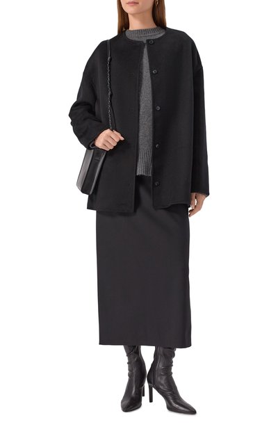 Полупальто Gio с круглым вырезом и спущенной линией плеч сшито из шерсти double face с добавлением кашемира. Модель силуэта «кокон» застегивается потайными пуговицами.