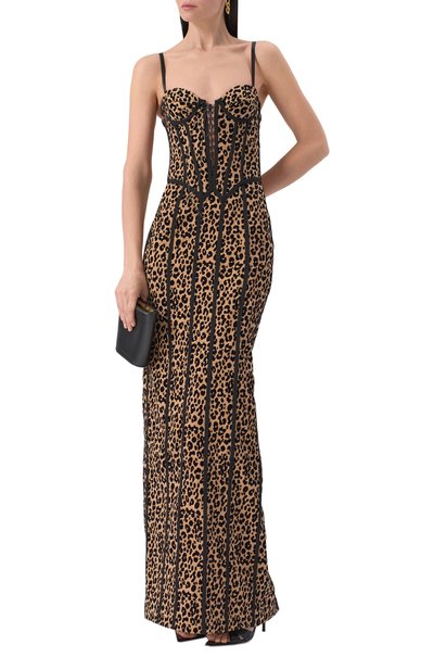 Платье с формованными чашечками и регулируемыми бретелями украсили декоративной шнуровкой спереди. Модель с высоким разрезом сшили из вискозы, плотно покрытой стразами. Сзади — потайная молния.