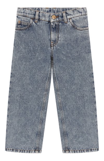 Джинсы с эластичной отделкой на поясе выполнили из хлопкового денима с эффектом делаве. Самый маленький из пяти карманов украсили заклепкой Medusa Kids.