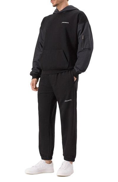 Джоггеры с боковыми карманами и поясом-кулиской сшили из хлопкового трикотажа. Принадлежность модели бренду обозначили небольшим контрастным логотипом спереди.