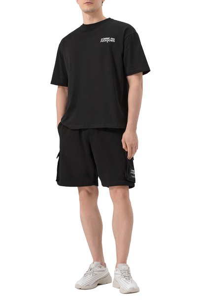 Шорты с поясом-кулиской и имитацией ширинки сшили из эластичного хлопкового трикотажа. Модель дополнили боковыми карманами и карго, украсив один из клапанов логотипом.