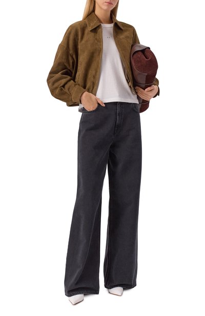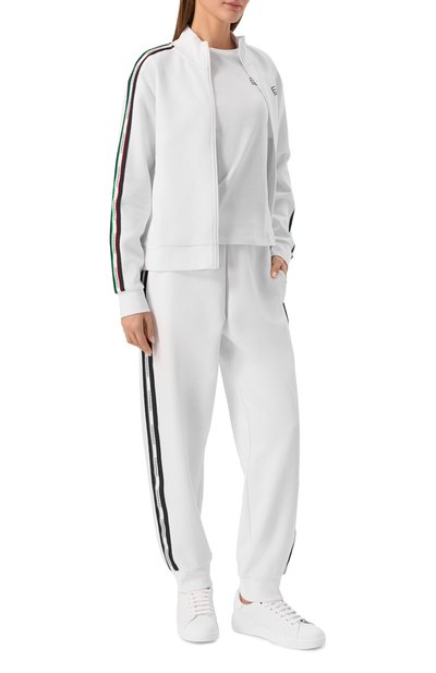 Полуприталенную футболку сшили из мягкого хлопкового джерси. Модель с чуть спущенной линией плеч украсили эмблемой спереди и крупным логотипом на спинке.