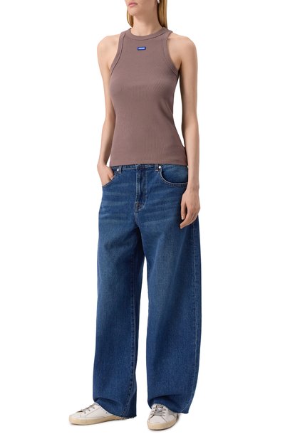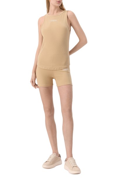 Майку с рельефным швом на спинке выполнили из стрейчевого хлопкового трикотажа в рубчик. Спереди изделие украсили логотипом марки.