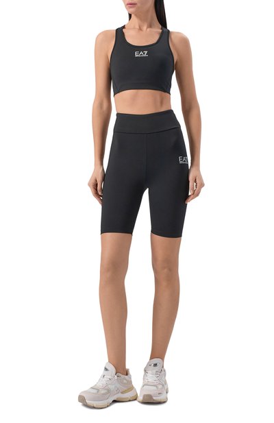 Шорты с широким поясом сшили из хлопкового трикотажа в рубчик с добавлением эластана. Спереди облегающую модель украсили контрастным прорезиненным логотипом.
