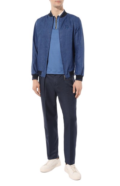 Поло с потайной молнией сшили из шелкового трикотажа. Модель с поясом и манжетами в рубчик, дополненными рифлеными полосами, органично впишется в образ и с джинсами, и с классическими брюками.