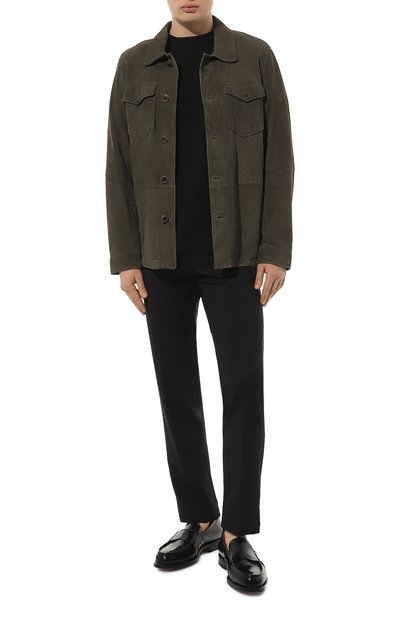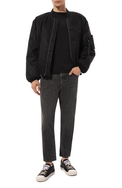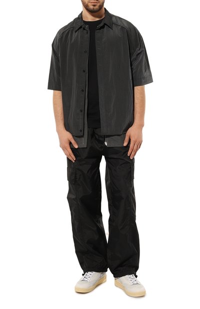 Футболку сшили из хлопкового трикотажа с добавлением шелка. Сбоку модель украсили металлическим октагоном и ярлыком в цветах итальянского триколора, а под круглой горловиной сзади — вышитой нитью в тон монограммой SR.