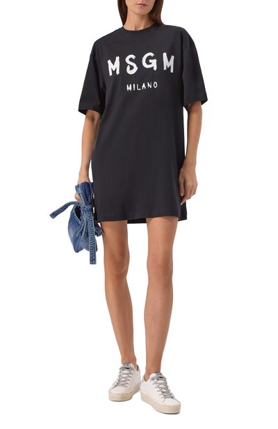 Футболку из хлопкового джерси украсили изображением фирменного игрушечного медведя спереди и эмблемой-смайлом сзади. Края oversize-модели подчеркнули длинной бахромой.