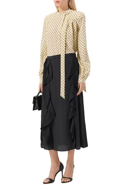 Макси-юбку Eveline с диагональными вставками и асимметричной драпировкой сбоку сшили из шелкового атласа. В кулиску на поясе модели продели фирменный длинный шнур с брендированной пластиной.