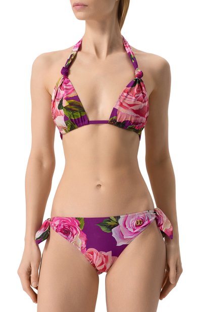 Раздельный купальник сшили из эластичной микрофибры с фирменным мотивом в виде роз и пионов. Посадка бра с плотными треугольными чашечками и плавок-бикини с монограммой DG регулируется завязками.
