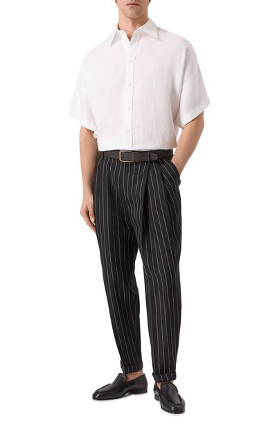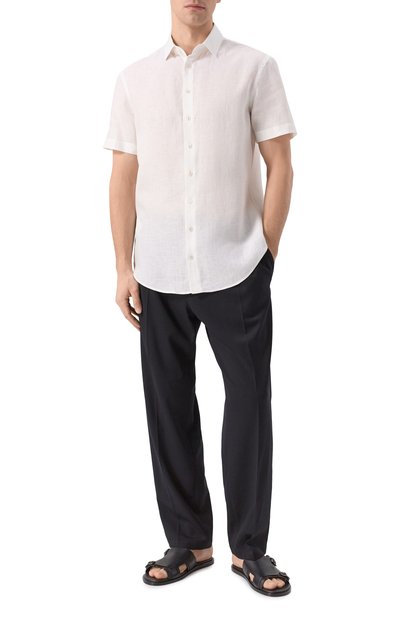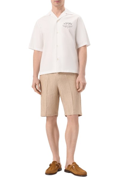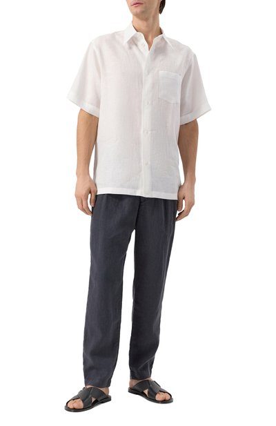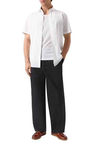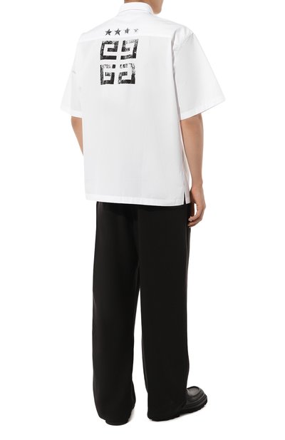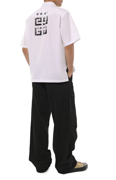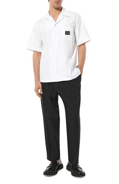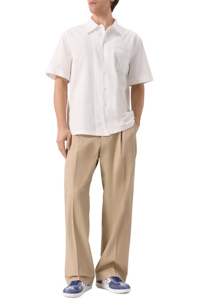 Рубашку с фигурным низом и банто вой складкой на спинке сшили из хлопкового поплина. Принадлежность марке обозначили патчем с геральдической эмблемой, вышитой канителью и бисером.