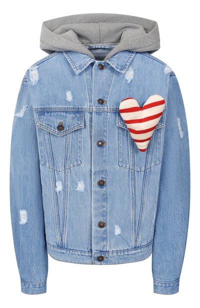 Джинсовую куртку с трикотажным капюшоном, создающими иллюзию двухслойного комплекта, сшили из чистого хлопка. Выбеленную модель с нагрудными и боковыми карманами украсили потертостями и объемной брошью-сердцем из ткани с принтом в виде морских узлов.