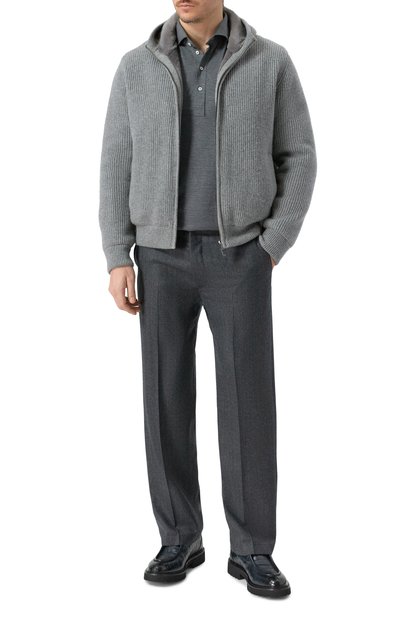 Для создания бомбера на подкладе из меха американской норки использовали плотный кашемир. Модель с внутренним и внешними боковыми карманами дополнили вязаными манжетами, поясом и отделкой воротника.
