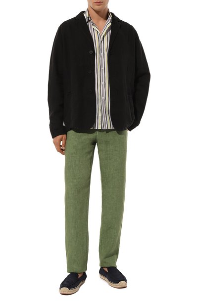 Для пошива брюк с полосатым поясом-кулиской в рубчик использовали стрейчевый флис из хлопка и лиоцелла, обработанный по технологии X-Soft для особенной мягкости. Модель дополнили накладным задним карманом и прорезными боковыми, под одним из которых – миниатюрная этикетка с фирменной акулой.