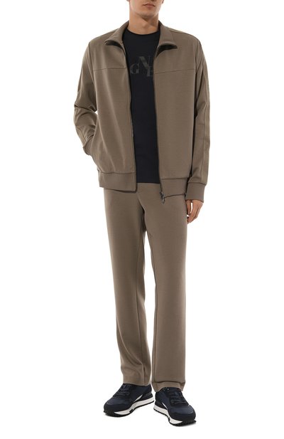 Для пошива брюк с полосатым поясом-кулиской в рубчик использовали стрейчевый флис из хлопка и лиоцелла, обработанный по технологии X-Soft для особенной мягкости. Модель дополнили накладным задним карманом и прорезны ми боковыми, под одним из которых – миниатюрная этикетка с фирменной акулой.
