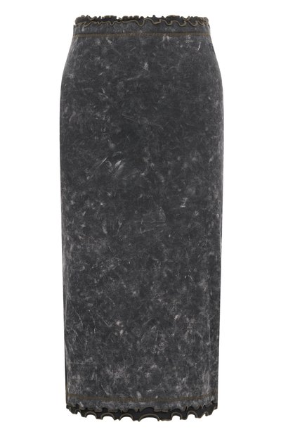 Юбку с выбеленным мраморным узором сшили из рифленого трикотажа стрейч на основе органического хлопка. Модель с двойными оборками на поясе и внизу дополнили клиновидными однотонными вставками по бокам. Под эластичным поясом вышили эмблему Oval D.