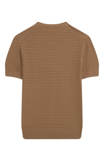 Напоминающий футболку пуловер создали из хлопковой пряжи. Изделие выполнили неплотной ажурной вязкой, а манжеты, пояс и кант вдоль горловины — резинкой.