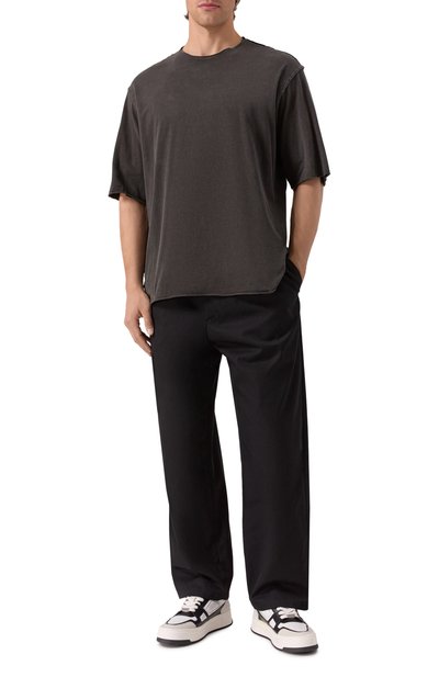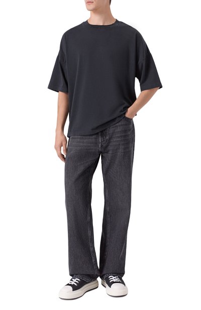 Oversize-футболку со спущенной линией плеч сшили из хлопкового джерси. Модель с вышитой спереди эмблемой марки украсили потертостями и разрезами, а края выделили градиентом, словно нанесенным аэрозольной краской.