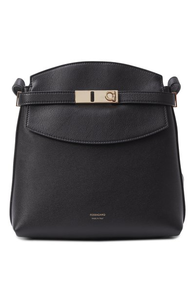 Сумку Hug messenger с регулируемым плечевым ремнем выполнили из зернистой кожи. Модель с застежкой на магнитные кнопки и внутренним карманом на молнии опоясывает узкий ремешок с фирменной пряжкой Gancini.