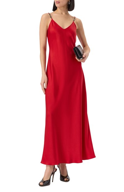 Для пошива атласного макси-платья использовали ацетат с добавлением вискозы. Модель с тонкими бретелями дополнили сзади потайной застежкой и длинными лентами, подчеркивающими вырезы.