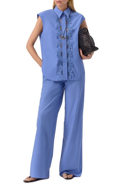 Блузу Gaetana с рукавами-крылышками и бантовой складкой на спинке сшили из тонкого шелка с принтом в виде парусников. Пуговицы спереди скрыли под планкой, оставив на виду одну серебристую верхнюю в форме морского узла.