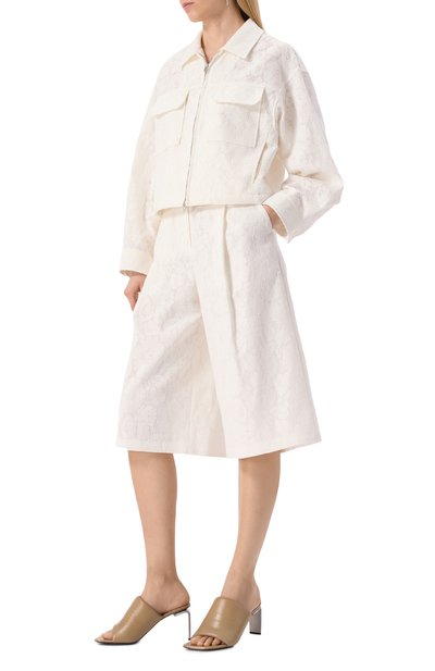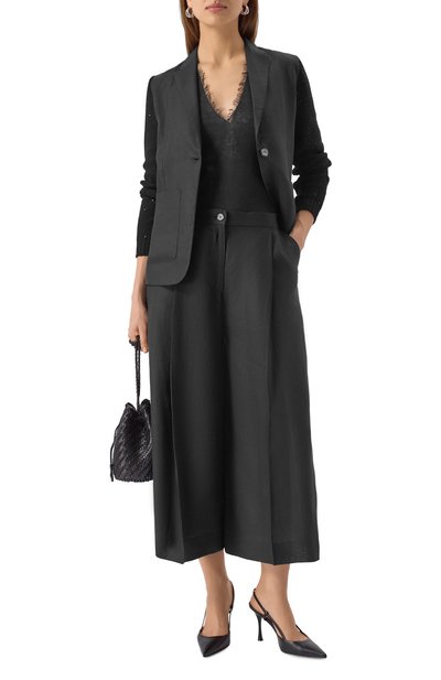 Кюлоты с защипами и шлевками для ремня дополнили четырьмя карманами. Модель сшили из костюмной ткани на основе полиэстера. В комплекте — регулируемый ремень с прямоугольной металлической пряжкой.