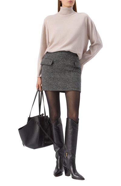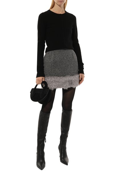 Мини-юбку с потайной молнией сбоку сшили из смесового твида на основе шерсти и полиэстера с добавлением металлизированных нитей. Наши стилисты предлагают носить модель с парным жакетом.