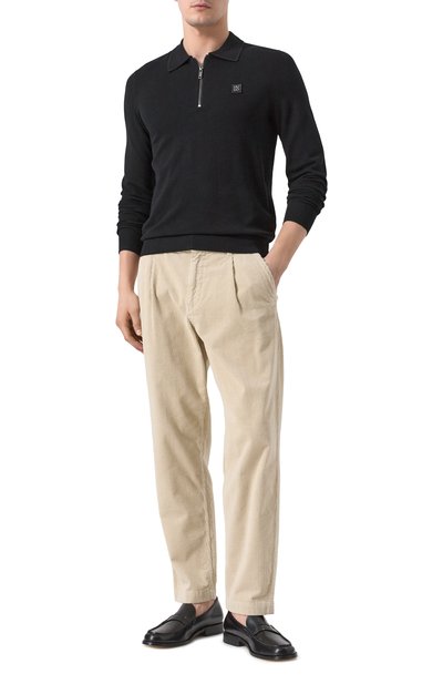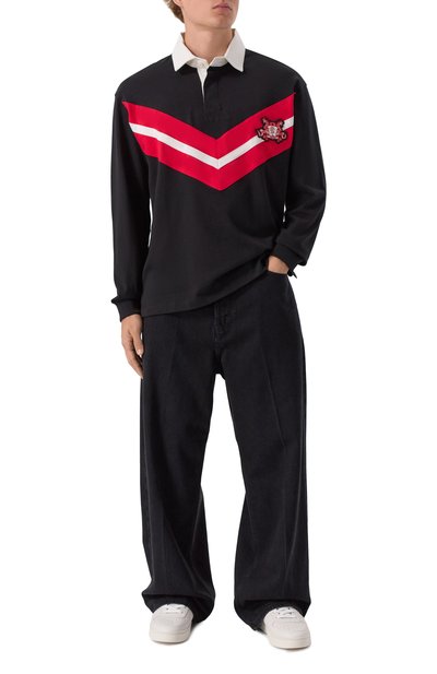 Поло со спущенной линией плеч и карманом «кенгуру» выполнили из хлопкового трикотажа в полоску. Спереди модель украсили вышивкой в виде логотипа бренда.