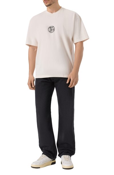 Футболку прямого кроя сшили из хлопкового джерси. Спереди и на спинке модель украсили флокированными эмблемами марки.