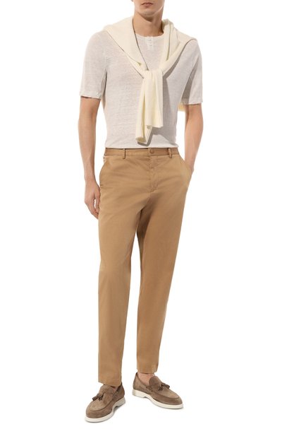 Футболку Tommy из коллекции, созданной совместно с Aston Martin, выполнили из тонкого хлопкового трикотажа с добавлением шелка и льна. Модель с узким контрастным кантом на круглой горловине в рубчик украсили спереди кожаным патчем в виде эмблемы а втомобильной компании.