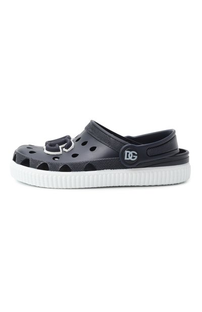 Резиновые сабо на контрастной подошве вошли в коллекцию Everyday Girl's. Модель с брендированным поворотным ремешком украсили объемной монограммой DG на союзке с перфорацией.
