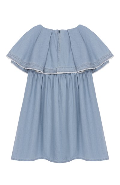 Лиф платья выполнили из однотонного хлопкового джерси, а рукава и пышный подол – из поплина в полоску. Модель с потайной молнией на спинке украсили цветочным принтом с монограммой DG.