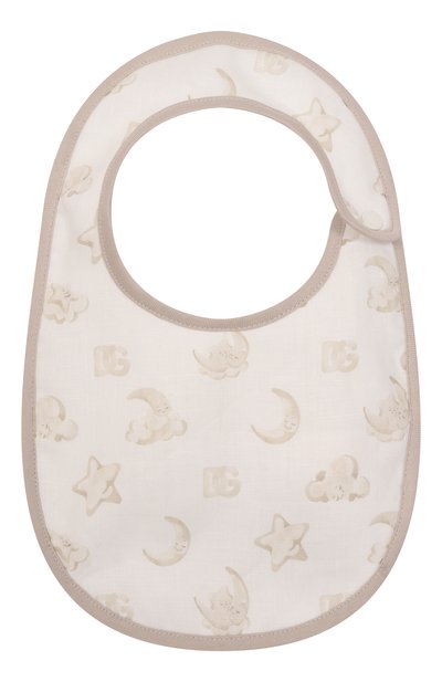 Нагрудник сшили из льняной ткани с брендированным паттерном из звезд и полумесяца. Модель с махровым подкладом застегивается кнопкой с логотипом.