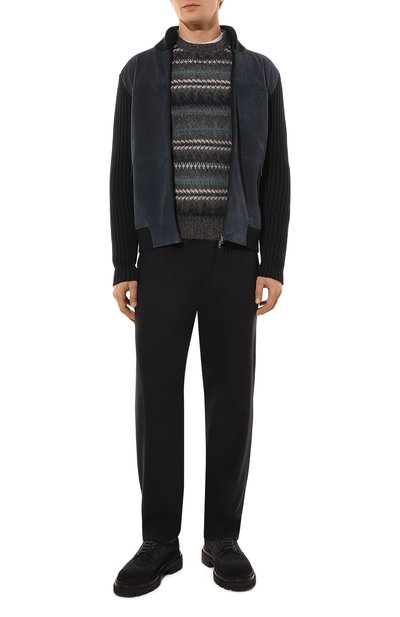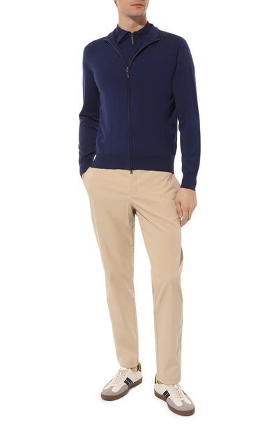 Кардиган с рифлеными манжетами, поясом и воротником-стойкой связали из хлопковой пряжи. Спереди модель со встречной молнией и двумя боковыми карманами дополнили вставками из перфорированной искусственной замши.