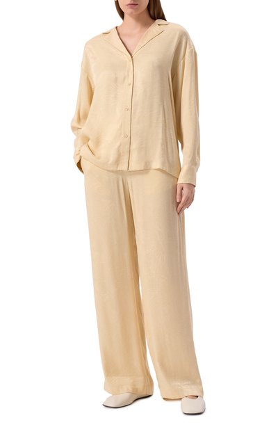 Брюки прямого кроя сшиты из чистого льна. Модель с высокой посадкой, эластичным поясом и имитацией ширинки дополнена парой прорезных карманов по бокам.