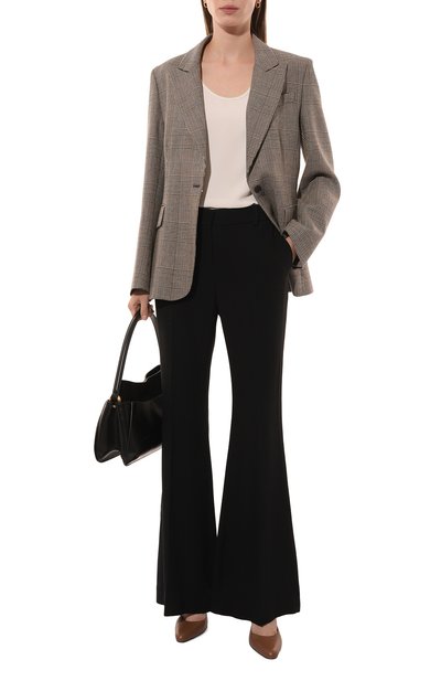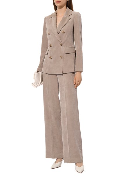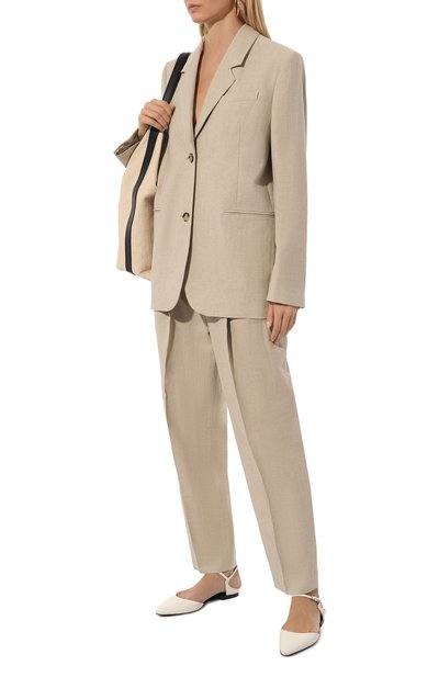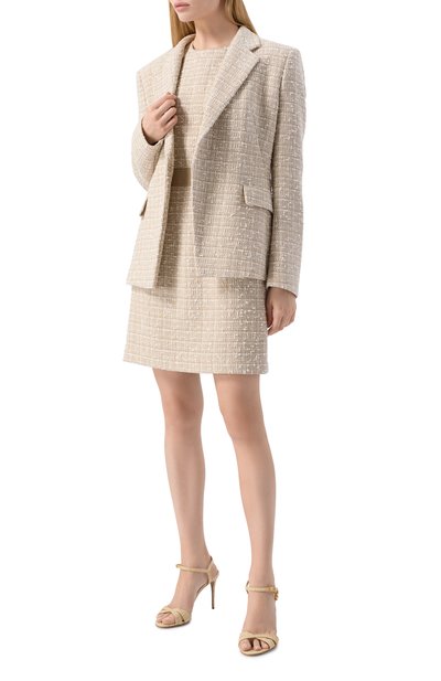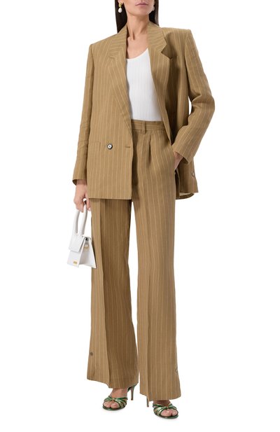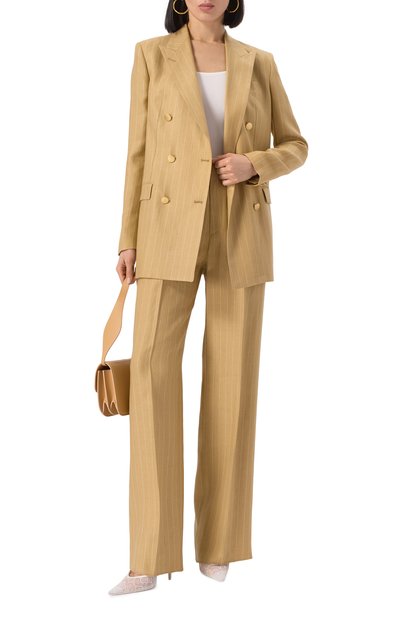 Двубортный полосатый жакет с золотистыми пуговицами сшили из стрейчевой ткани на основе хлопка и льна. Модель со шлицей сзади дополнили прорезным нагрудным карманом и боковыми с клапанами.