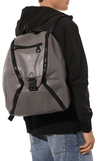Рюкзак с сетчатой спинкой сшили из хлопка и полиэстера с жаккардовым узором в виде фирменного логотипа. Наружный карман изделия укрепили экокожей и дополнили D-образным кольцом. Внутри модели предусмотрели еще два небольших кармана и отсек для ноутбука.