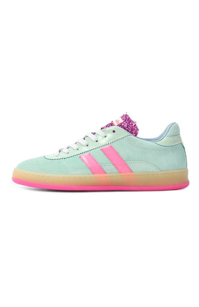 Замшевые кеды дополнили кожаными накладками. У модели на прошитой резиновой подошве предусмотрели молнию вдоль шнуровки. Язычок с металлизированным покрытием украсили брендированным патчем.
