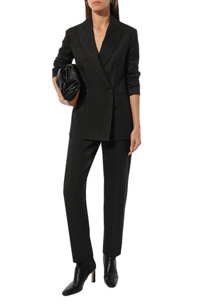 Жилет с широкими лацканами и двумя врезными карманами с клапанами сшили из смеси льна и хлопка в вертикальную золотистую полоску. Модель застегивается тремя брендированными пуговицами в тон.
