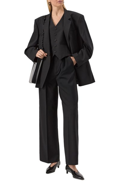 Однобортный жакет с прямоугольными лацканами и акцентированной линией плеч дополнили тремя карманами. Oversize-модель из шерстяного твила в по лоску составит элегантный костюм с парной юбкой-карандаш.