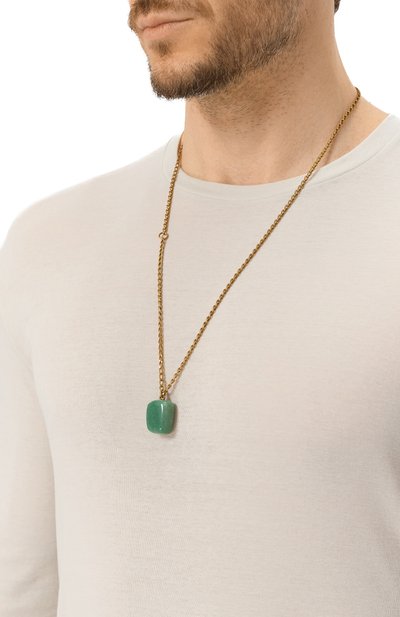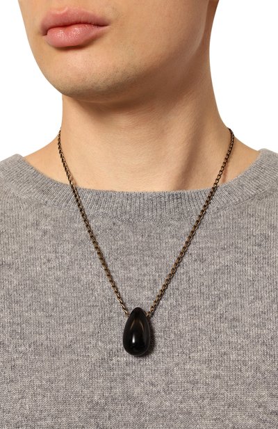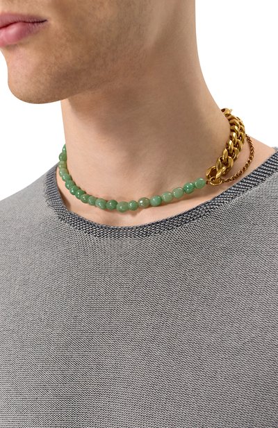 Комбинированное колье составлено из крупной латунной цепи с серебристым покрытием и фигурных бусин из полудрагоценных камней. Застежка-карабин дополнена брендированной подвеской-пластиной.