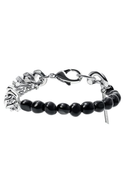 Регулируемый браслет-цепочку с застежкой-карабином выполнили из латуни. Аксессуар с брендированным шармом дополнили глянцевыми бусинами из полудрагоценных камней.