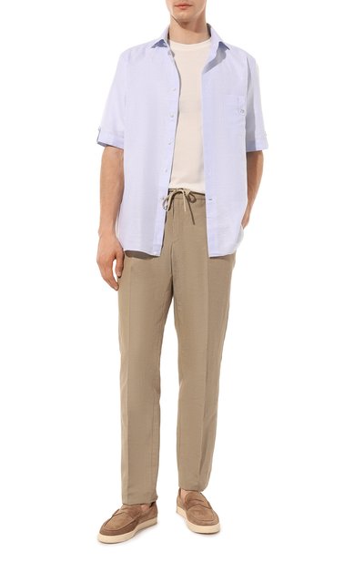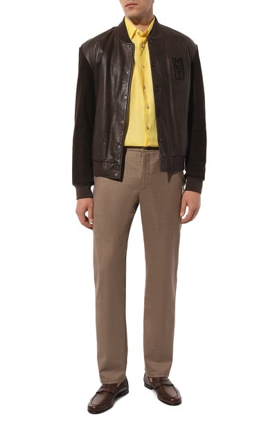 Для пошива рубашки свободного кроя использовали блестящую шелковую ткань. Модель с отложным воротником и боковыми разрезами дополнили объемными нагрудными карманами с клапанами на пуговицах.