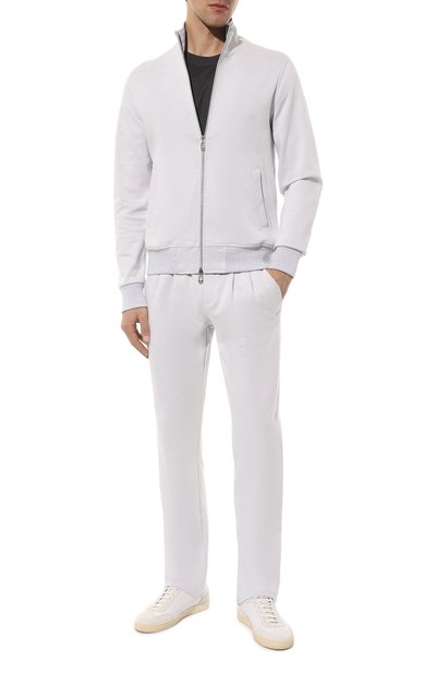 Брюки свободного кроя сшили из гладкого хлопка. Модель со средней посадкой и широким поясом-кулиской дополнили одним накладным и четырьмя прорезными карманами.
