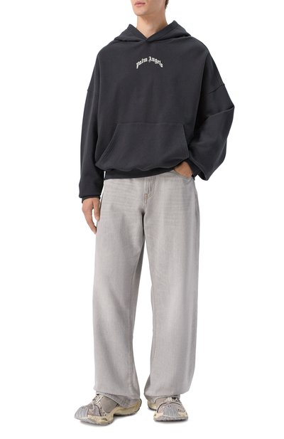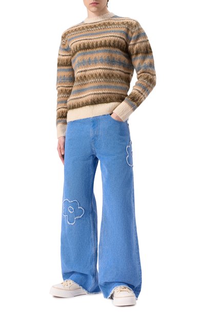 Джинсы с имитацией ширинки дополнили боковыми карманами, а также задними прорезным и передним карго с клапанами на пуговицах. Посадка выбеленной модели из чистого хлопка регулируется широкой лентой, продетой в эластичный пояс-кулиску.