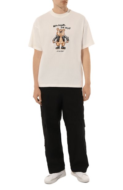 Для пошива футболки со слегка спущенной линией плеч использовали хлопковое джерси. Спереди модель украсили принтом, в который вписали фирменную надпись Not From Paris Madame.