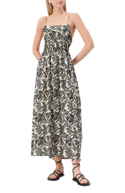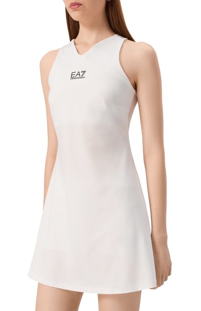 Облегающее мини-платье сшили из стрейчевого хлопкового трикотажа в рубчик. Модель с узкими бретелями украсили спереди контрастным логотипом марки.