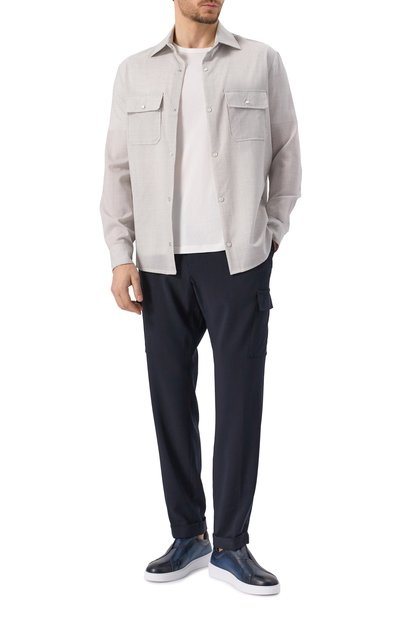 Кеды без шнуровки выполнили из зернистой кожи и окрасили в готовом виде, создав на поверхности легкую патину. Модель на широкой подошве украсили фирменными стежками в тон на язычке с тисненым логотипом и заднике.